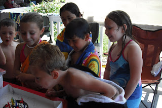 Kaid had his birthday party today at our Aunt Kathy's pool. He had so much fun with his friends and family! I can't believe that he is already 7 years old. What a big guy! Instead of cake, all the kids got a giant cookie with icing. Messy, but fun. I wish our St. Louis family could've been there, but we'll be up to see them on Thursday, and the party will really begin. We have 4 bbq's planned over the 3 day weekend. Crazy!